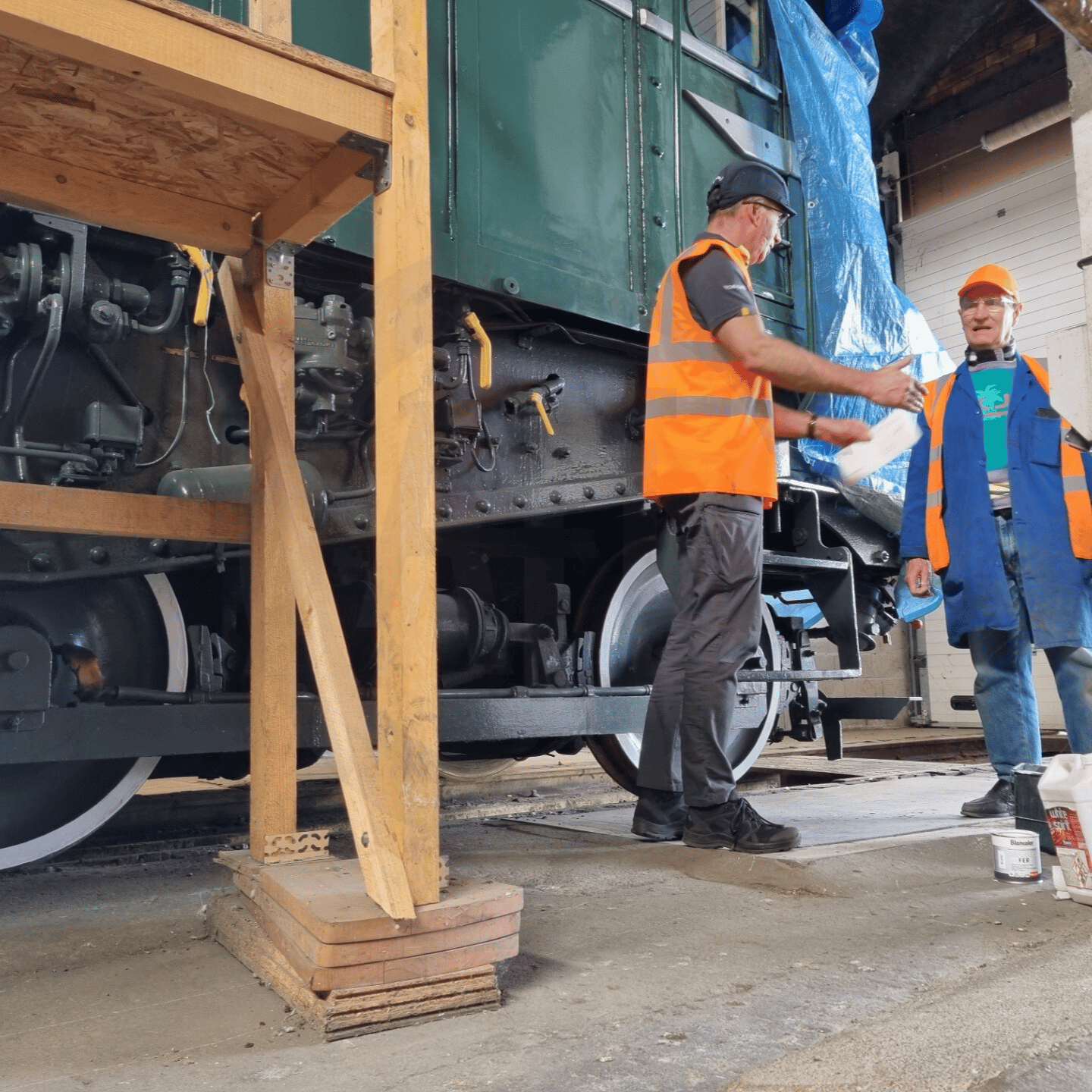 Lors de l’Assemblée Générale de 2025, un projet a été porté par notre trésorier, Philippe M. : repeindre les roues de la 2D2-9135 en blanc. Cette initiative, à la fois esthétique et symbolique, visait à mettre en valeur cette machine emblématique destinée à l’exposition statique. En effet, la peinture blanche des roues est une pratique couramment utilisée pour les locomotives présentées au public.